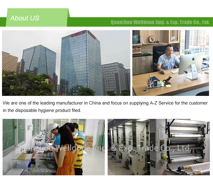 WELLDONE अग्रणी कंपनियों में से एक है, जो जिंजीयांग शहर, फ़ुज़ियान प्रांत, चीन में स्थित डिस्पोजेबल स्वच्छता उत्पाद क्षेत्र में ग्राहक के लिए ए-जेड सेवा की आपूर्ति पर केंद्रित है।